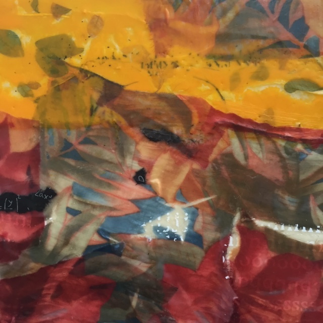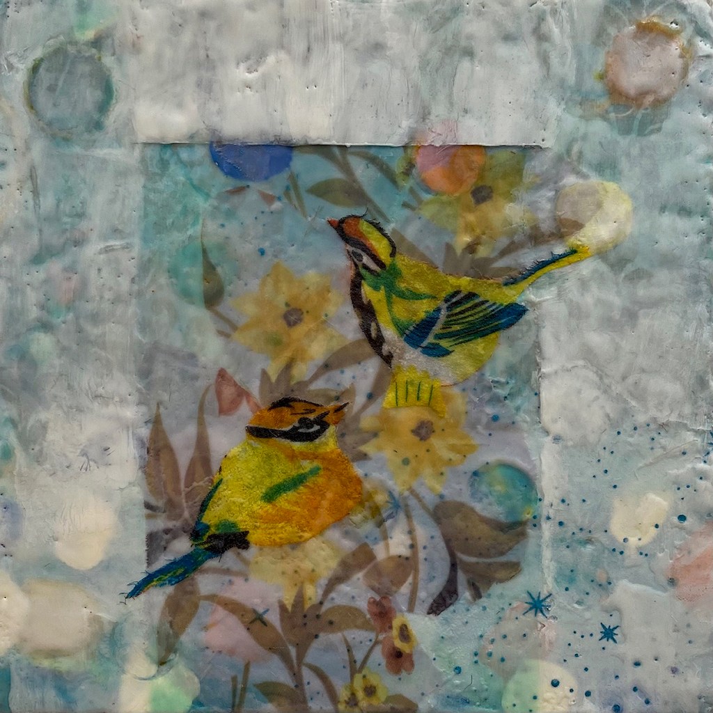 Encaustic, fabric and mixed media on board, 12” x 12”, $600